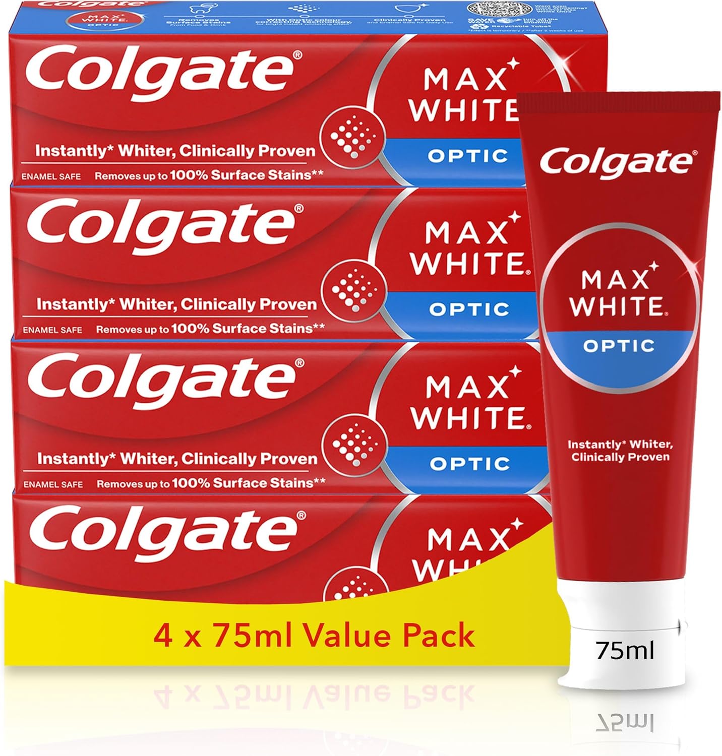🦊 Colgate Max White Optic Toothpaste 4X75ml – Teeth Whitening Toothpaste – Clinically Proven Formula – Removes up to 100% of Surface Stains – Optic Brighteners Instantly Whiten Teeth-AUTO WIN