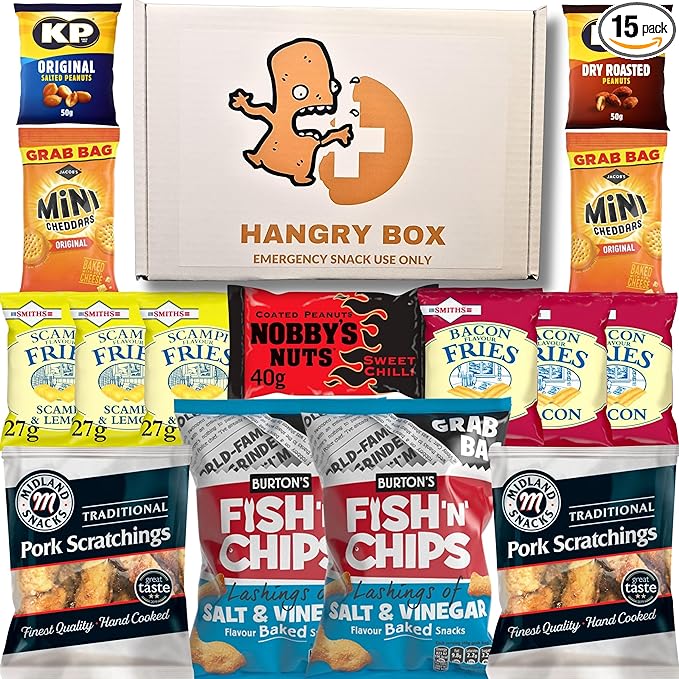 Savoury Pub Snacks – 15 Item – Movie Night Snacks Hamper – Pork Scratchings, Burton’s Fish & Chips, Smiths Bacon Fries, Scampi Fries, Nobby’s Nuts, Peanuts, Mini Cheddars
