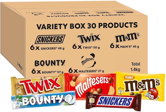 🦊Mixed Bulk Chocolate Box, M&M’s Peanuts, Snickers, Twix, Maltesers, Bounty, 1.4kg – 30 Full-Size-AUTO WIN