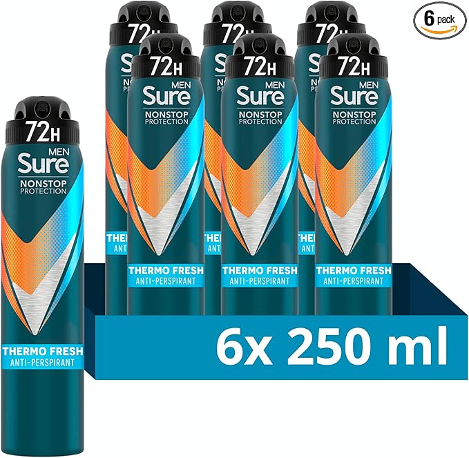 🦊Sure Thermo Fresh Nonstop Protection Antiperspirant Deodorant (6x 250 ml) with Body Heat Activated technology Aerosol Spray for 72-hour sweat and odour protection 6x 250 ml-AUTO WIN