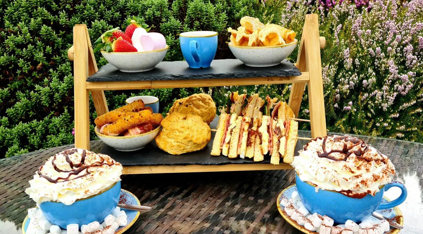 Selection of sandwiches, pigs in blankets, mozzarella sticks with sweet chilli sauce, chocolate fondue with waffle, marshmallows, strawberries, scones cream and jam.