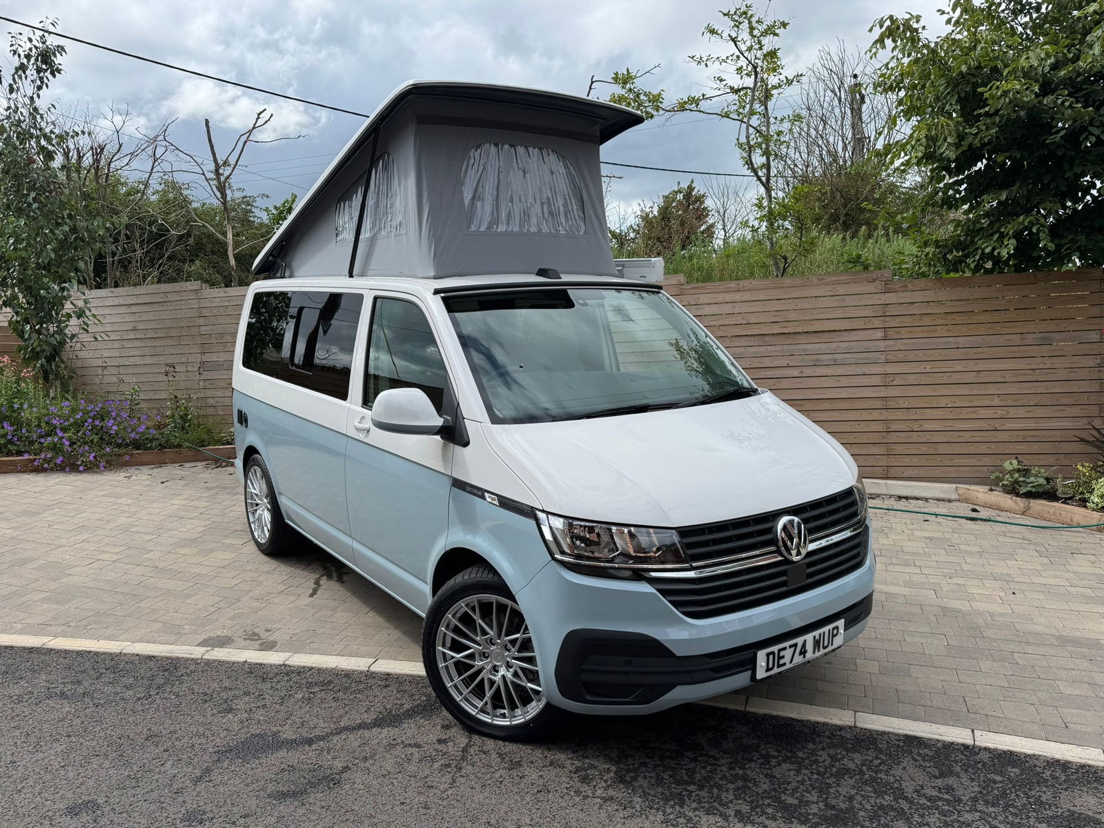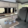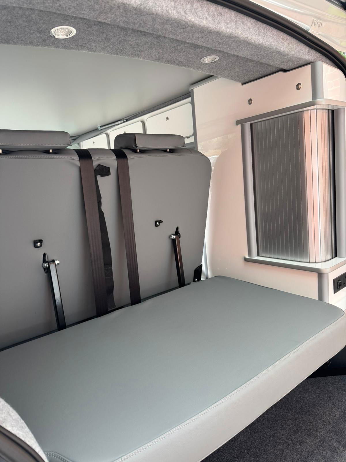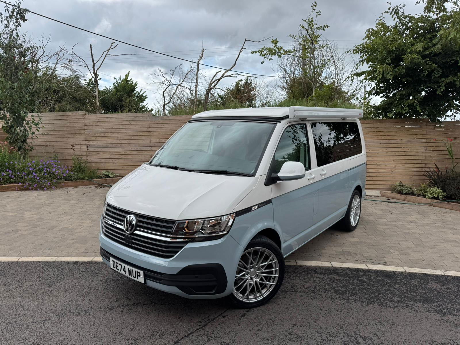2024 Transporter Finished in Stunning CANDY WHITE/FLANNEL GREY Paintwork, with the superb Camper King St Tropez interior. Heated Rear Screen and Wiper, Diesel Heater, Deluxe Upholstery, Wireless Charging Pad, 20L integrated Water Tank, Gas hob, Sink with running water, 4 Berth, Pop top roof, LED lighting, Leisure/Auxiliary battery, Fridge, 4 Belted seats, Isofix on rear seats, DAB Radio and Touchscreen, Bluetooth, Apple Car Play/Android Auto/Mirror Link, Air conditioning, Cruise Control, Rear Parking Sensors, Multifunction Steering Wheel. Electrically adjustable door mirrors, Electric front windows, 2 Keys.  all newly converted by Camper King
