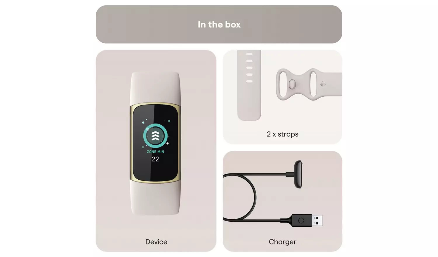 • Accessories included: Small & large bands, charge cable, including charger.