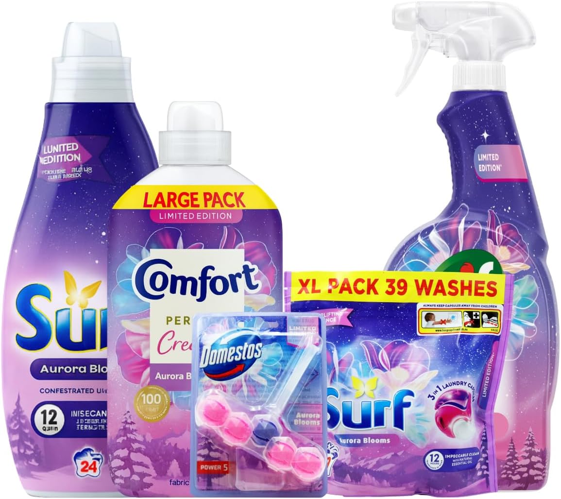 COMPLETE BUNDLE: Aurora Blooms cleaning set includes Comfort Creations fabric softener (45 washes), Surf liquid detergent (24 washes), Surf 3-in-1 capsules (39 washes), Cif spray, and Domestos rim block