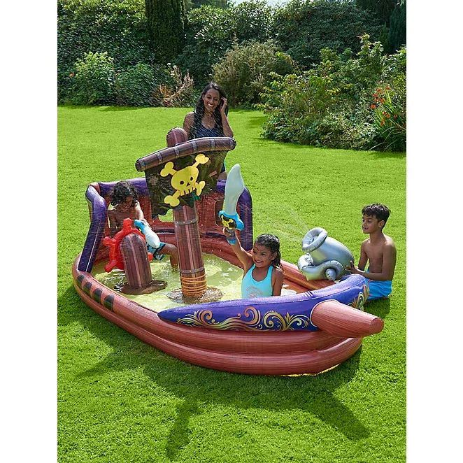 Play centre includes fantastic features: Turnable inflatable steering wheel. Inflatable cannon with hose connection for spraying water. Two inflatable swords for conquering the high seas. The water sprayer attaches to a garden hose to keep kids cool in the summer and add even more fun to playtime.