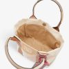• Structured shape, double top handles, brand text print at front, detachable printed brand tag, one main compartment, internal slip pocket, contrast trims and stitching, woven texture, gold-toned hardware