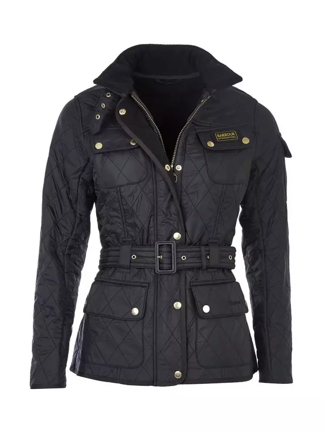 Barbour International Polar Quilted Jacket-AUTO WIN 29/11 Updating the iconic Barbour International look with a cosy polarquilt combination, this slim-fitting design features a diamond-quilted outer and a fleece lining for luxurious warmth with a soft feel. Four studded pockets, a funnel collar with neck strap, a sleeve pocket and shoulder patches retain the authentic biker-jacket look, while a buckle-close belt creates a flattering silhouette.