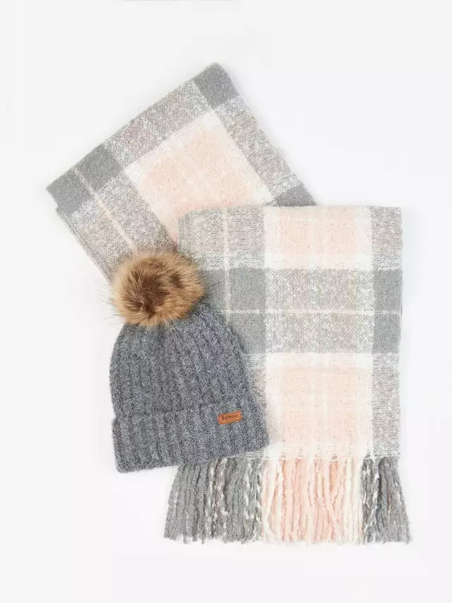 Barbour Saltburn Beanie Hat & Check Scarf Gift Set, Grey/Rose-AUTO WIN 29/11