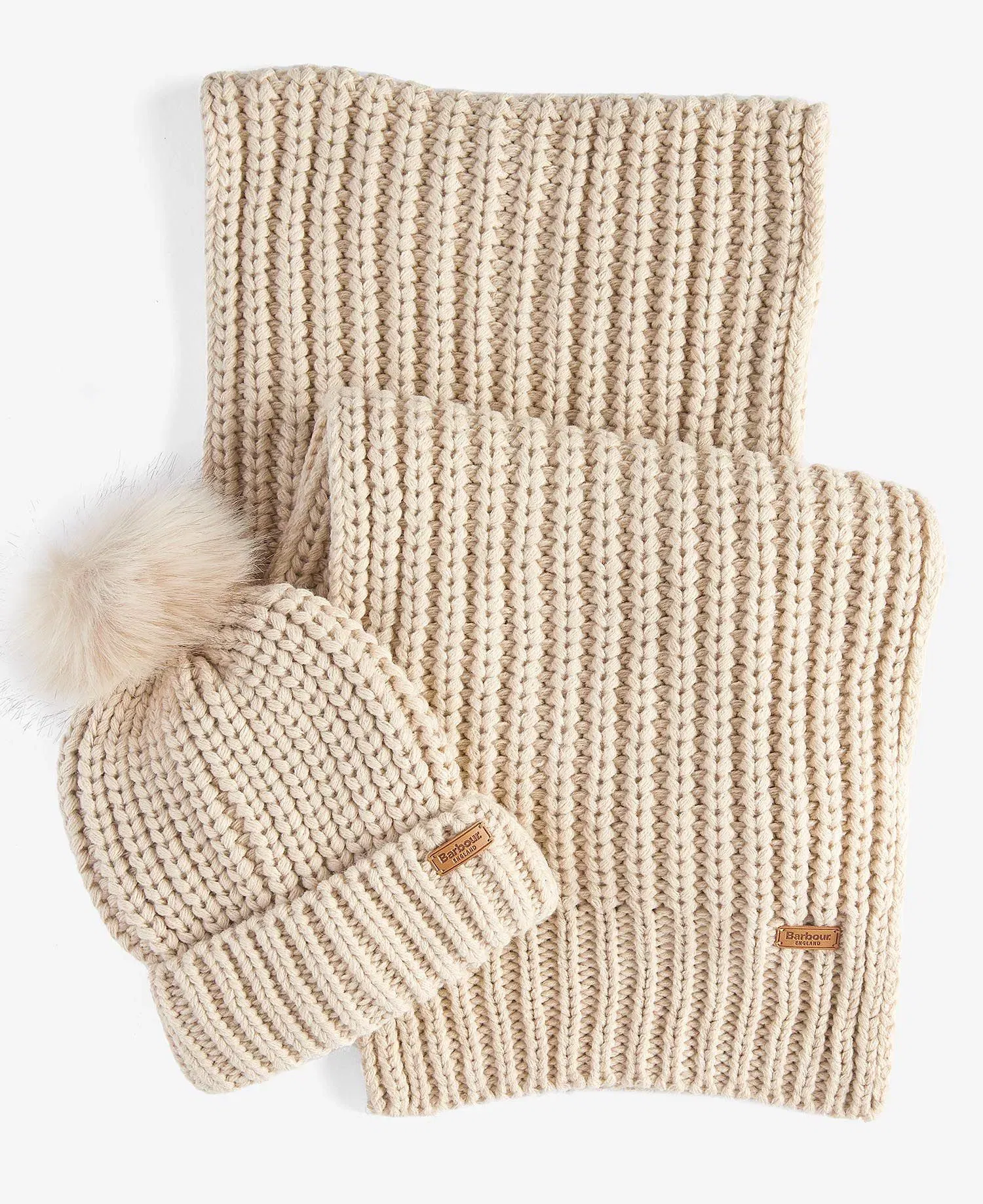 Barbour Saltburn Faux Fur Pom-Pom Beanie Hat & Scarf Gift Set, Pearl-AUTO WIN 01/02