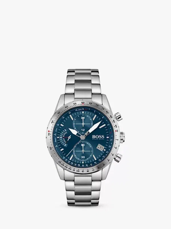 BOSS 1513850 Men’s Pilot Chronograph Bracelet Strap Watch, Silver/Blue