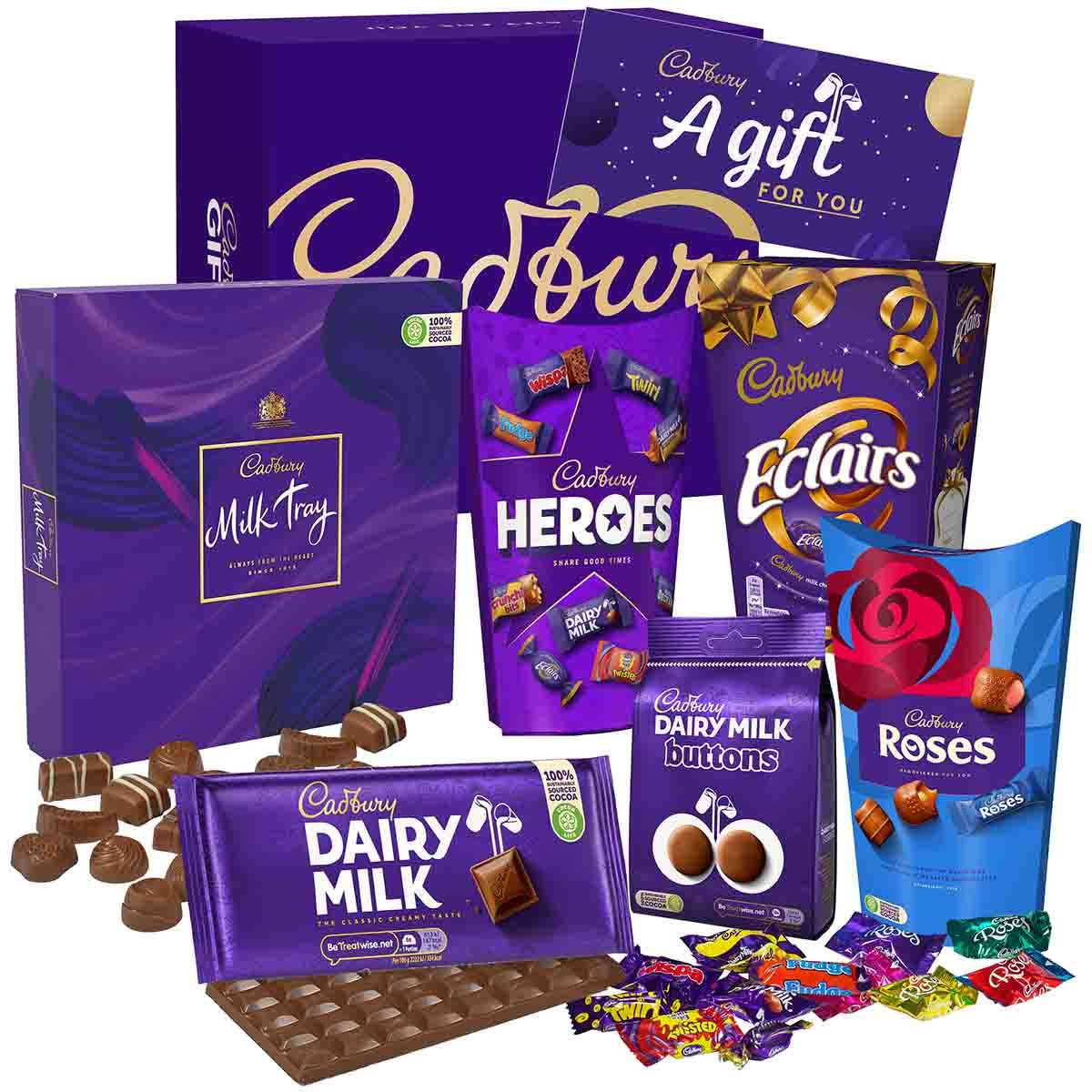 CELEBRATE: Cadbury Dairy Milk, Heroes, Roses, Eclairs and Dairy Milk Buttons – a classic selection of your favourite Cadbury chocolate.
