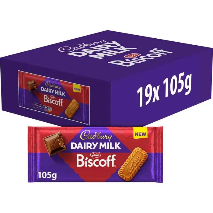 New for 2025! The great taste of Cadbury Dairy Milk now with Lotus Biscoff. We’ve taken the classic, creamy taste of Cadbury Dairy Milk chocolate and added in something truly special – the irresistible crunch of Lotus Biscoff biscuits. The result? The chocolate you love, with a biscuit twist you’ll adore! This 105g chocolate bar combines the creaminess of Cadbury Dairy Milk with the irresistible caramelised sweetness and crunch of Biscoff -This box of 19 bars is perfect for sharing with friends and family or enjoying all to yourself!