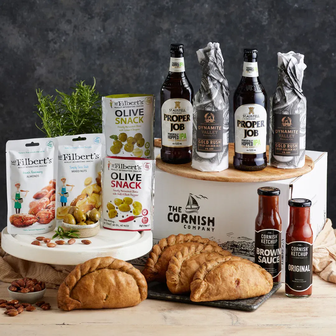 Indulge in “The Mighty Hamper,” where every item is a testament to Cornwall’s rich flavors. From the iconic steak pasties to the hop-infused Proper Job IPA and the golden Dynamite Valley Gold Rush, this hamper is a curated celebration of local gastronomy. Enjoy the finesse of Mr. Filbert’s gourmet nuts and the regional flair of Cornish condiments. Each element is chosen to offer a memorable taste of Cornwall’s culinary heritage, perfect for any connoisseur.