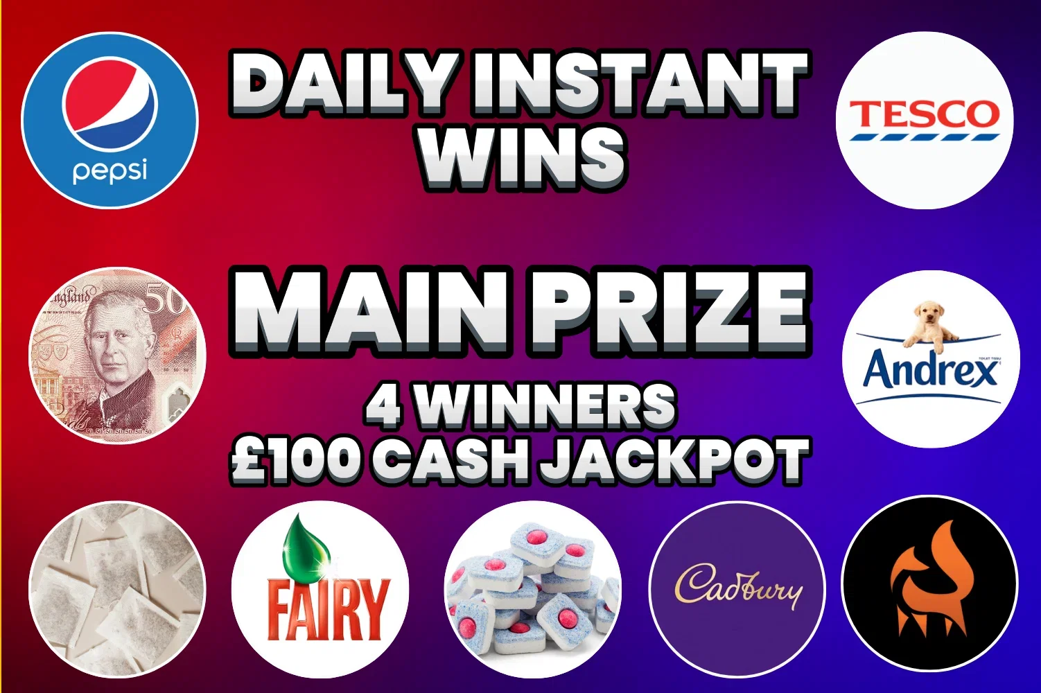DAILY INSTANT WINS! MAIN PRIZE 4 WINNERS £100 CASH JACKPOT – AUTO WIN 25/04