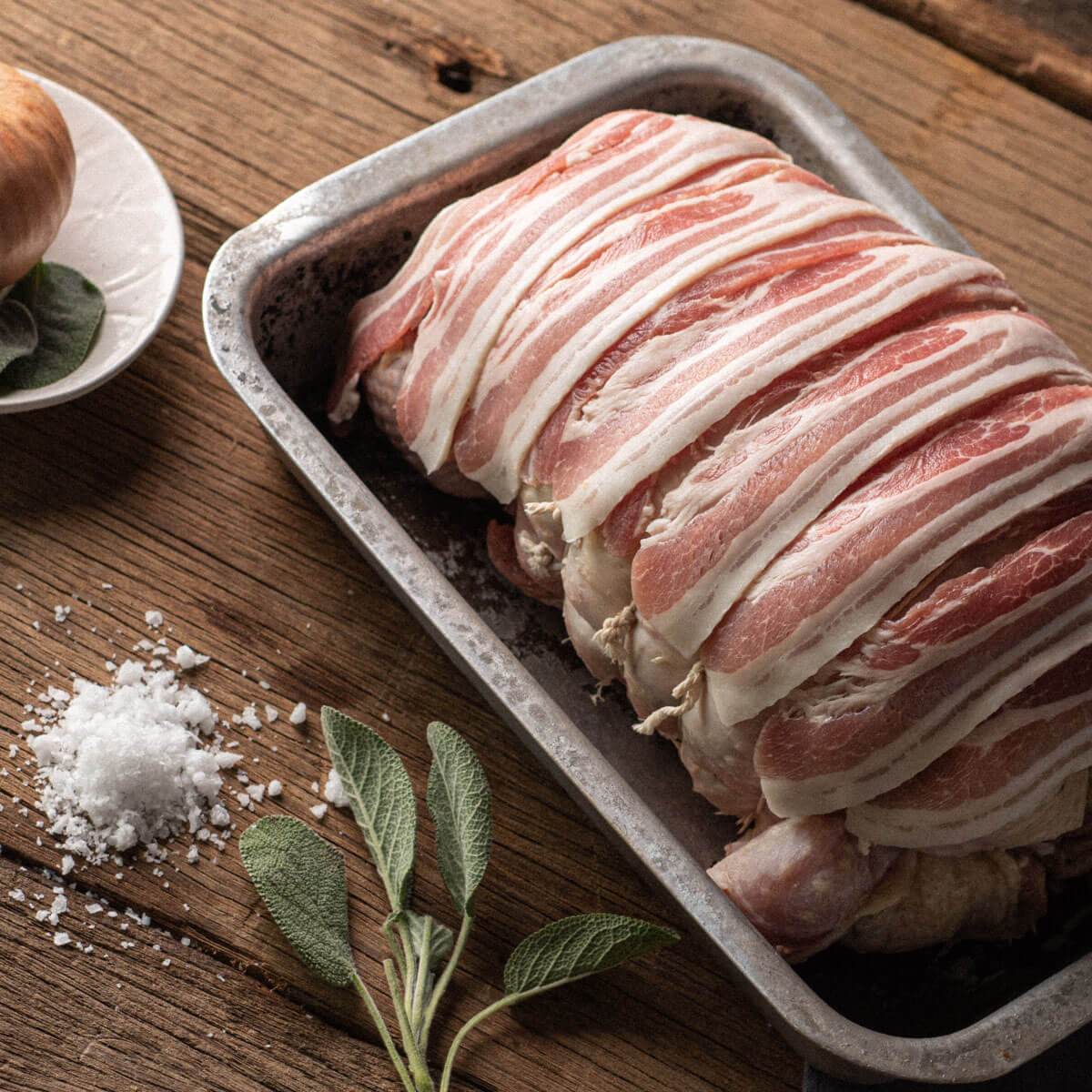 his delicious boneless roast is carefully boned and rolled into the class cylindrical shape and features a bacon topping for an extra succulent and tasty roast, as well as a sage & onion stuffing, blended with our traditional handmade sausage meat.