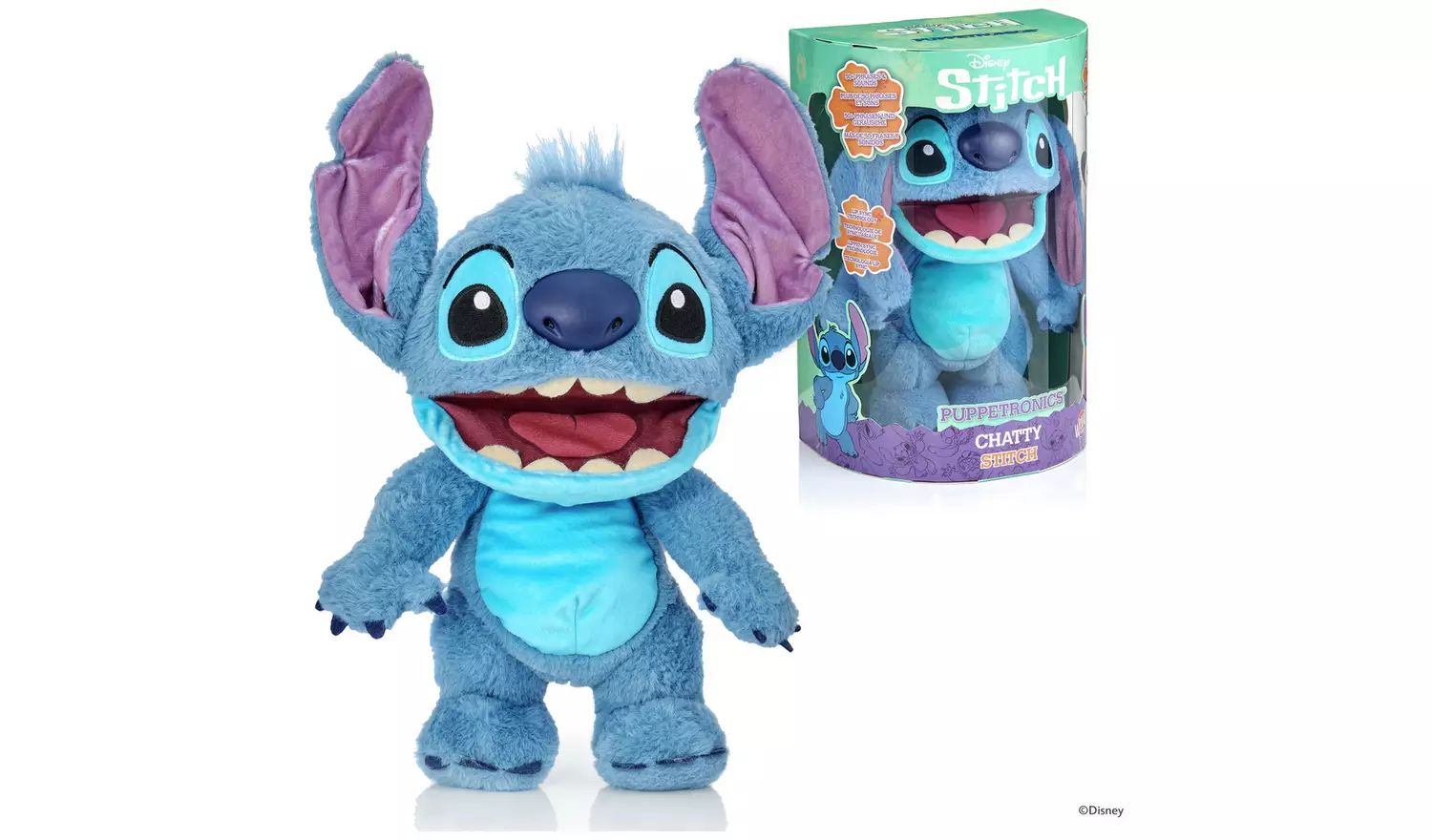 Introducing Disney Chatty Stitch, the latest Puppetronics innovation by WOW! Stuff, blending puppetry and animatronics to bring Stitch to life. With 50+ phrases, sound combos, and advanced lip-sync technology, Stitch speaks Tantalog, moves his mouth and head, and responds to touch. Showcase moods with buttons for grumpy or mischievous expressions. Pair him with Chatty Angel for synced moods, conversations, and unique interactions. At 30cm tall, this cuddly toy is perfect for hugs, play, and adventure. © 2024 Disney.