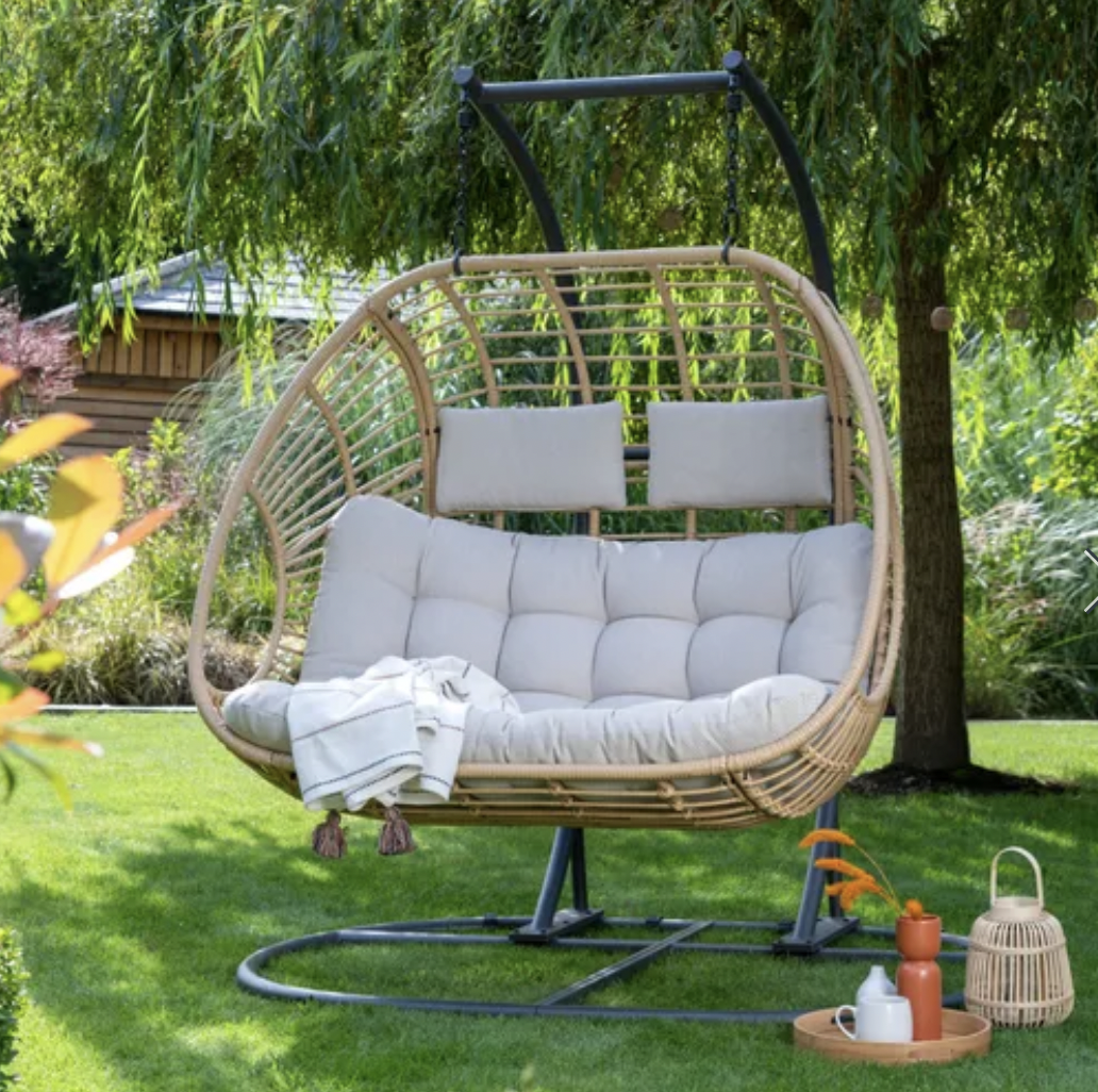 Relax in style with our Double Egg Chair, designed with a strong metal structure and a modern rattan hanging chair. The chair is weather resistant with a powder coated steel frame, making it suitable for use all year round and is sure to last you for years to come!