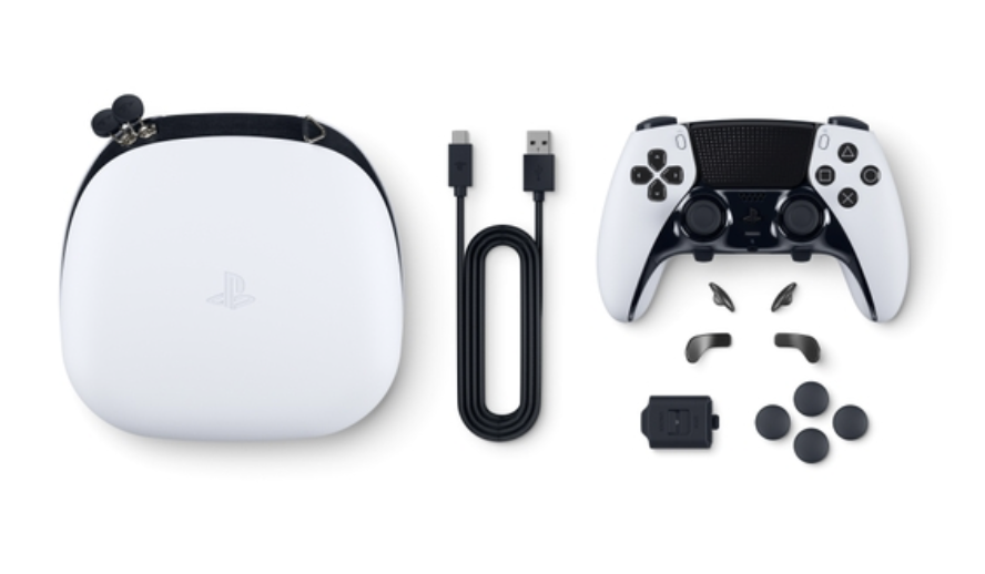 • Contents: DualSense Edge wireless controller, USB braided cable, 2 Standard caps (attached to controller), 2 High dome caps, 2 Low dome caps, 2 Half dome back buttons, 2 Lever back buttons, Connector housing, Carrying case, Instruction manual