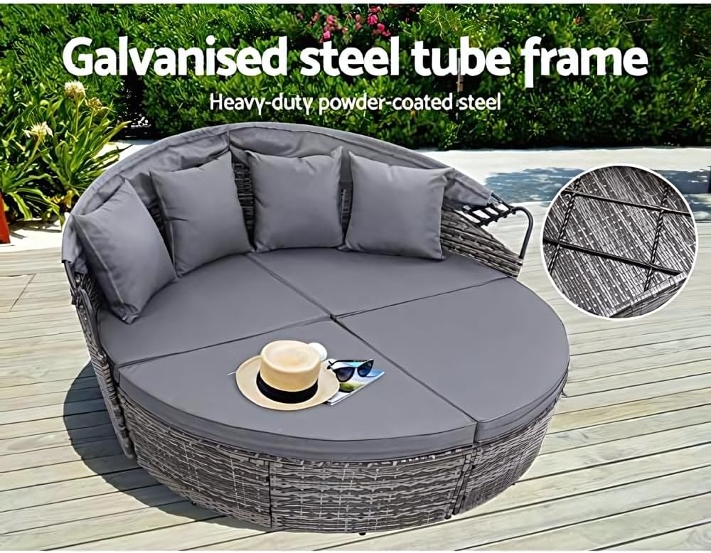 - Year Round Elegance: Experience the spacious comfort of the Evre Bali Day Bed, designed to add style and practicality to your garden or patio. Its circular shape offers ample room to relax without occupying excessive space. Stay protected from the sun with the extendable canopy, ensuring year-round enjoyment. Elevate your outdoor space with the perfect blend of functionality and elegance