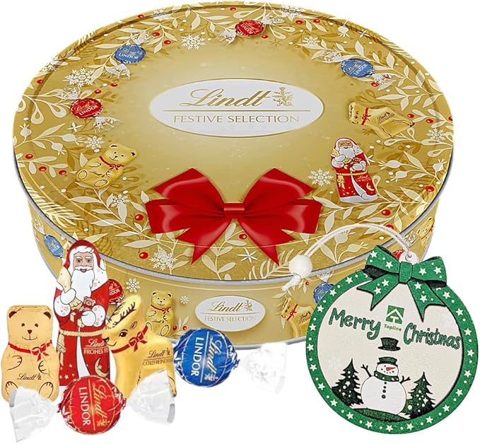- Indulge in the ultimate Lindt chocolates experience this holiday season with the Festive selection of irresistible smooth assorted chocolate truffles, presented in the Golden Wreath Tin 400g gift box with Topline Christmas tree decoration. This beautifully presented sweets gift box is the perfect way to spread joy, warmth, and sweetness during the festive season. Whether you’re looking for delightful stocking fillers or memorable Secret Santa gifts for women.