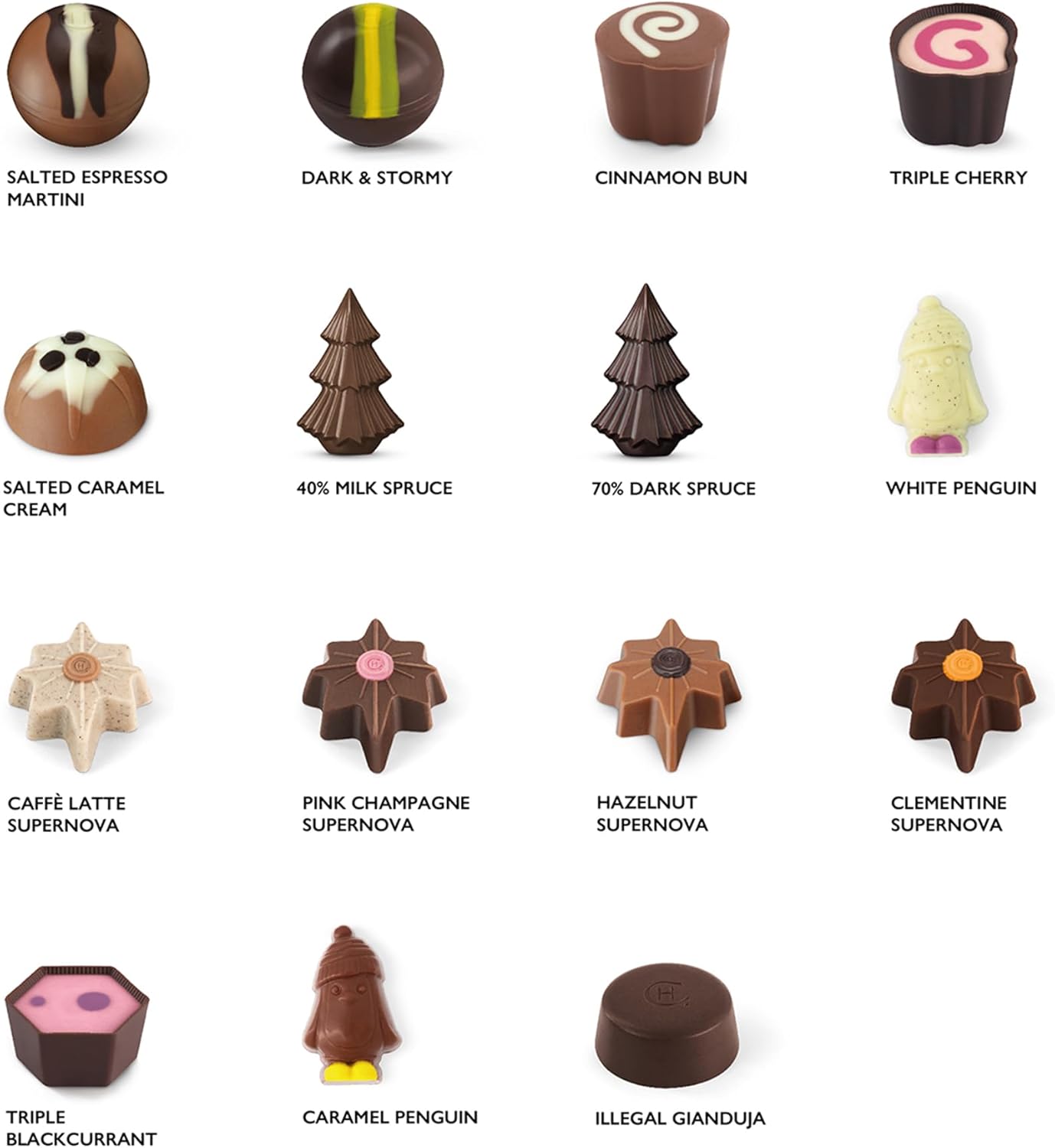 - 28 of Hotel Chocolat’s classic and Christmas chocolates, elegantly presented in a festive-themed box