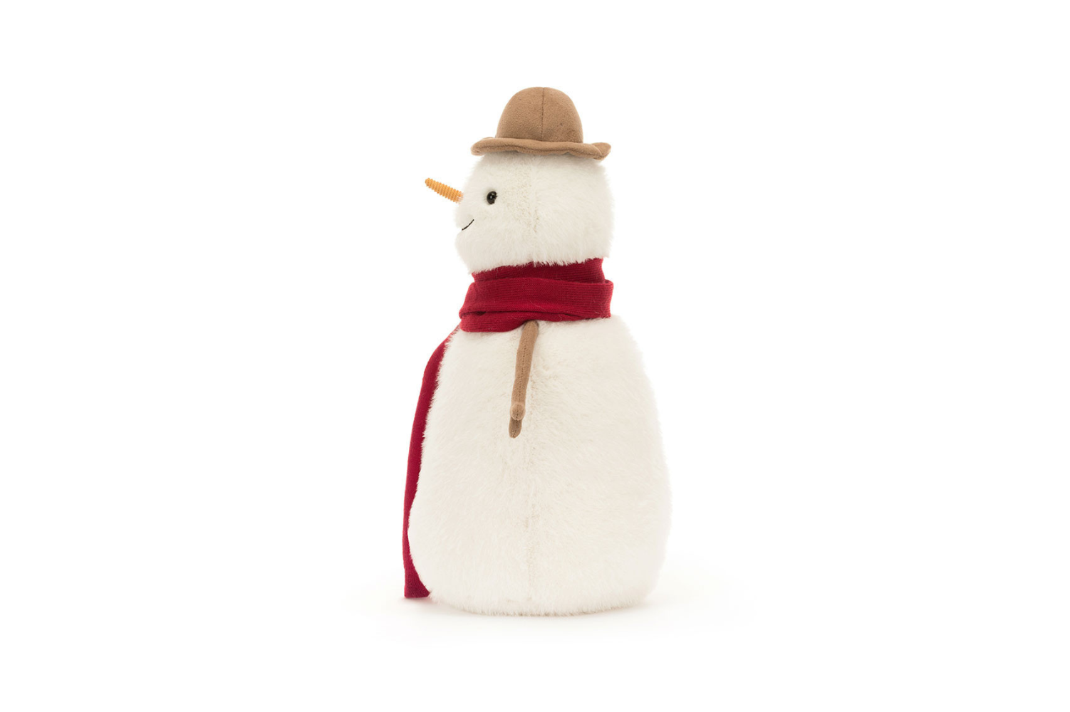 Jesse Snowman has fuzzy cream fur, cord stick arms with textured ends and a suedette hat with a notch in the brim. Jesse wears a long scarlet scarf, wrapped twice around for good measure. With safe stitch buttons, a weighted base, a cord carrot nose and a cheerful grin, this snowman is pretty magical.