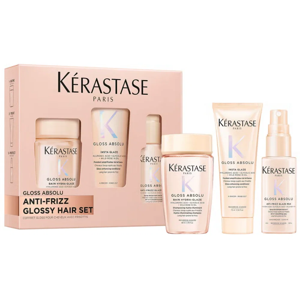 - 1 x Kérastase Gloss Absolu Bain Hydra-Glaze Hydra-Illuminating Shampoo (80ml) – a high-foaming gel shampoo designed to cleanse, hydrate, and enhance shine for all hair types, including frizzy hair. Infused with Hyaluronic Acid, Glycolic Acid, and Wild Rose Oil, this shampoo works to smooth the hair cuticle, creating an ultra-smooth surface that reflects light for up to four days of glossy, frizz-free hair. The formula gently purifies the scalp and fibre surface, leaving hair feeling clean, bouncy, and radiant with long-lasting freshness. The luxurious fragrance blends bright citrus top notes with an elegant floral bouquet and a warm base of Vanilla and Sandalwood, delivering a sensorial haircare experience. For optimal results, use alongside the entire Kérastase Gloss Absolu range.