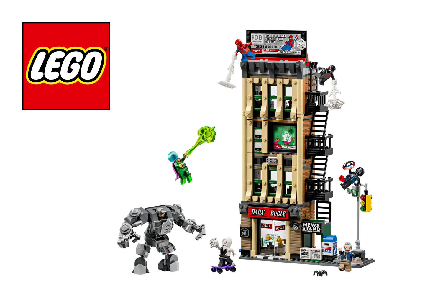 Explore 4 levels of Super Hero action with Spider-Man vs. Mysterio: The Daily Bugle (76342), a Spider-Man building toy gift for boys, girls and kids ages 10 years old and up. Great to build, play with and put on display, this collectible Spider-Man building set is packed to the rooftop with LEGO® ǀ Marvel minifigures and pretend play adventures. The Daily Bugle LEGO ǀ Marvel building toy comes with Spider-Man, Miles Morales, Ghost Spider, J. Jonah Jameson, Mysterio, Venomized Captain America and Rhino minifigures, plus 3 transparent sticks and 2 transparent bricks to enable mid-air action. There’s also a jointed Rhino mech with an opening cockpit. The detailed interior includes offices, reception, newsroom tech, a cash safe and a workingbillboard-changing lever. Outside there is a fire escape, movable newspaper stand and a street corner with traffic lights. Download the LEGO® Builder app for a collaborative Build Together experience with friends and family. Building set contains 781 p ieces.