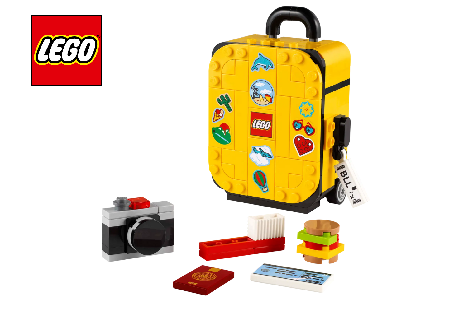 Grab your passport and get ready for adventure with this LEGO® Yellow Travel Suitcase (40817) luggage model building kit. This holiday-themed set makes a fun gift for kids aged 7 and over, or anyone who loves to travel. The mini suitcase features a retractable handle, functioning wheels and a luggage tag. Open the case to pack the camera, boarding pass, toothbrush and passport – have fun making everything fit! The set comes with a fun sticker sheet to customise the outside of the case.
