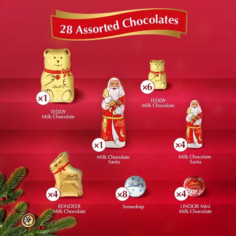 Bring home the magic this Christmas with the Lindt Gold TEDDY Advent Calendar. Our Master Chocolatiers have combined their unrivalled expertise with the finest ingredients to create 24 delicious festive chocolate treats hidden behind an adorable 3D TEDDY. Discover an irresistible selection of Swiss chocolates, from our iconic LINDOR Chocolate Truffles to our signature chocolate SANTA – not forgetting our creamy chocolate Snowdrops. Prepare to delight in a series of luxury chocolate surprises as you countdown to Christmas with Lindt…