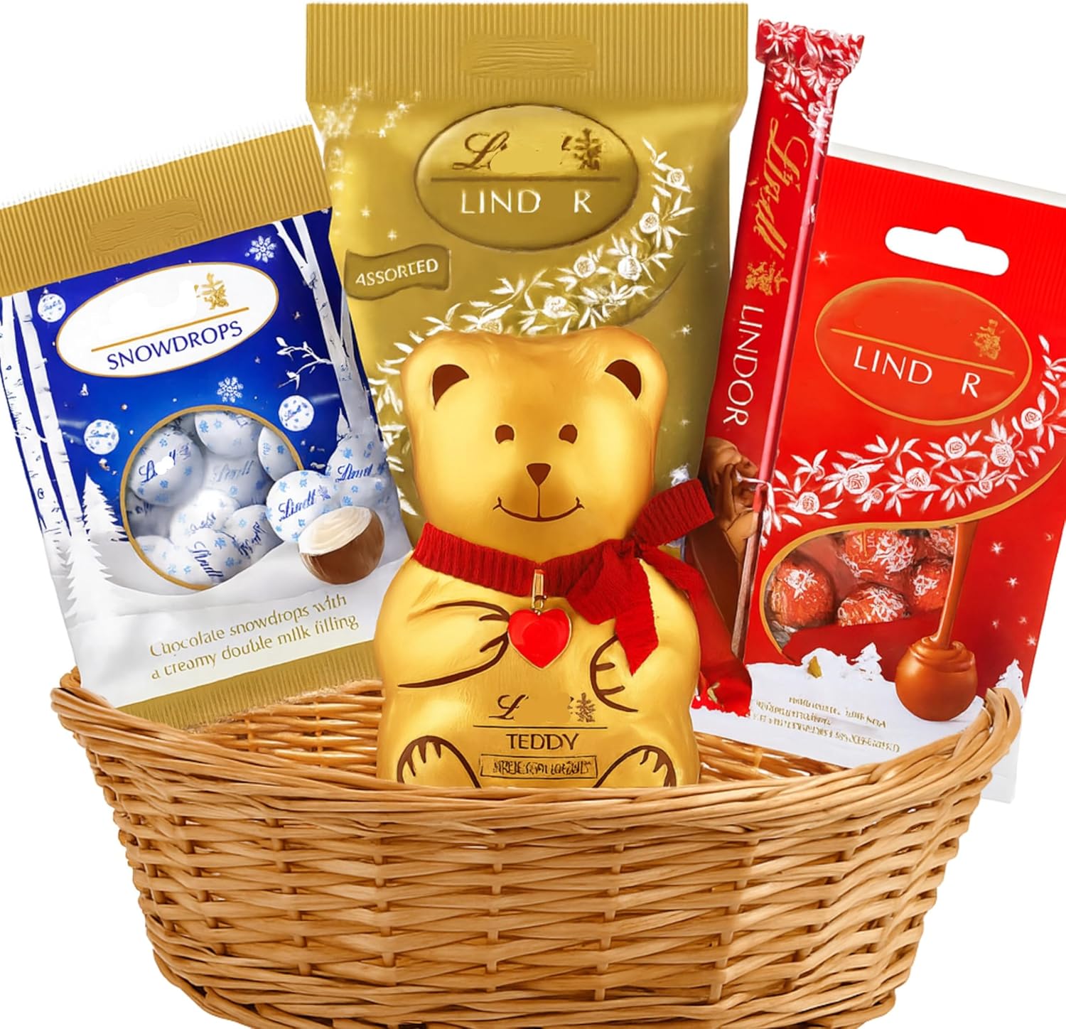 - Llindt christmas hamper – This elegant hamper includes a gold Lindt Teddy, Lindor truffles, Snowdrops, and assorted treats – beautifully wrapped and ready to gift this Christmas. Chocolate gift christmas