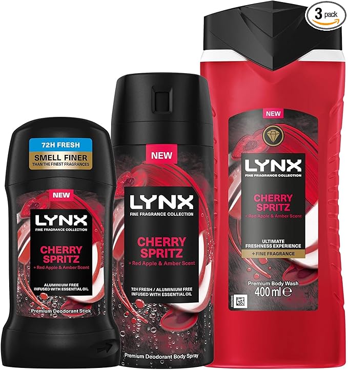 Lynx Fine Fragrance Collection of Cherry Spritz Body Spray 150ml and Deodorant Stick 50ml with Body Wash 400ml-AUTO WIN 19/10