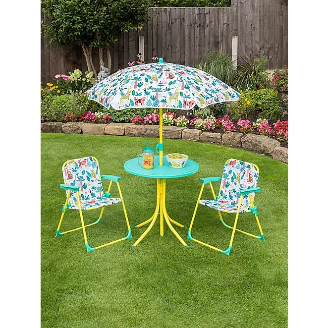 Our 4 piece kids garden patio set is a fun pick for younger children. Including 2 folding chairs with frame safety locks and a 50cm diameter table with a lift up parasol, its ideal for tea parties, and with no tools required it can be put up and taken away quickly and conveniently. Jungle animal deisgn on the fabric seats and parasols, yellow metal frame and teal plastic table top and arm rests.