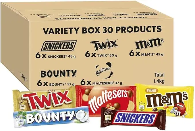 MIXED CHOCOLATE BOX, M&M’S, SNICKERS, TWIX & MORE, 30 X MILK CHOCOLATE BARS & BAGS