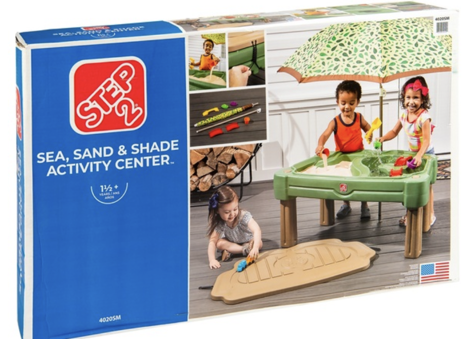 The Sea, Sand and Shade Activity Centre is made for sensory play. This fun-filled sand and water table comes with a large parasol for sun- safe play. Kids can sail the 2 boats and splash in the water, make sandcastles in the sand, and race cars across the bridge roadway.