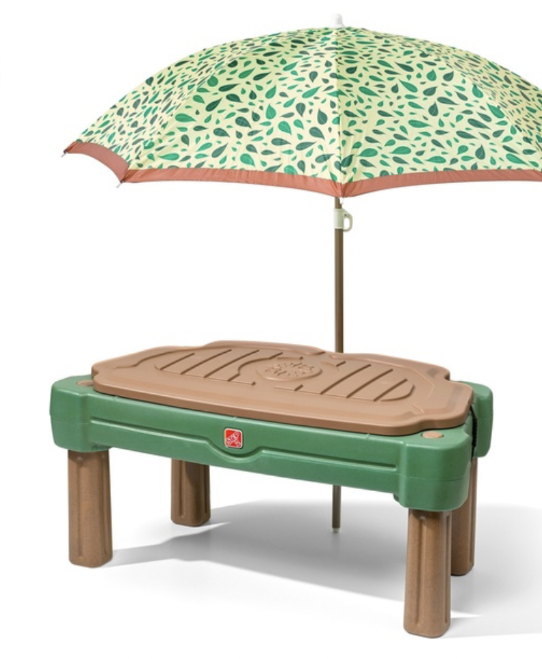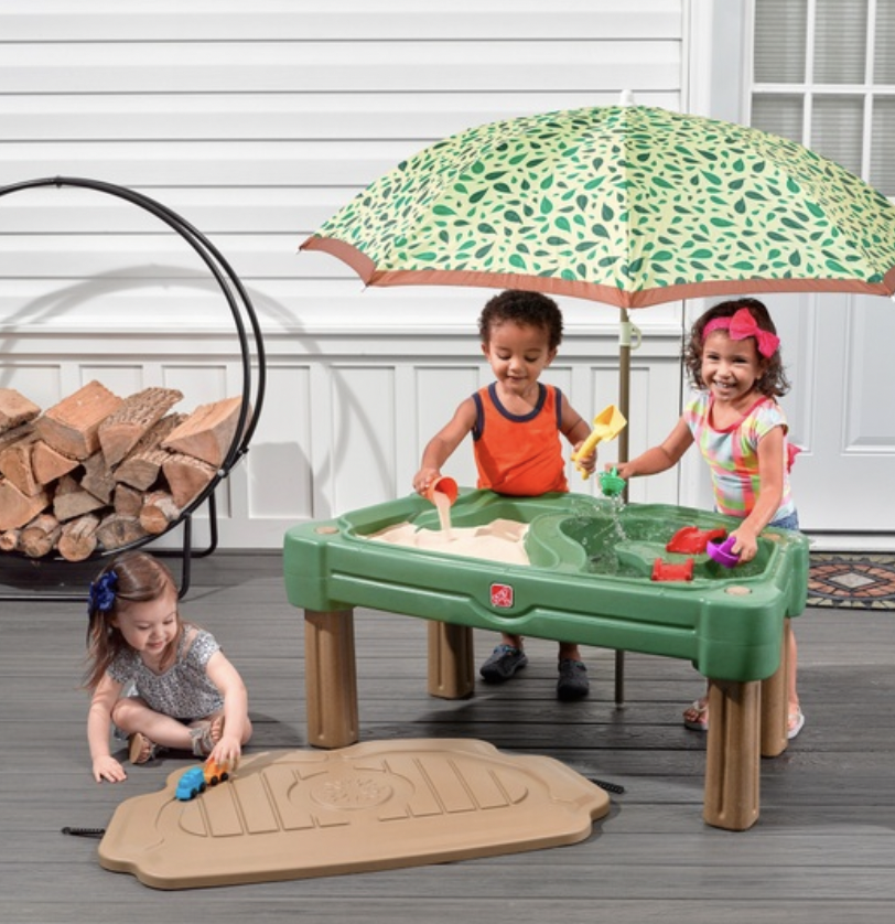 This sand and water table has a plastic lid that doubles as a play surface with winding roadways. When playtime fun is done, clean-up is easy with drain plugs in both sides. Elastic tie-downs secure the lid to the Sea, Sand and Shade Activity Centre, keeping out critters and providing covered toy storage.