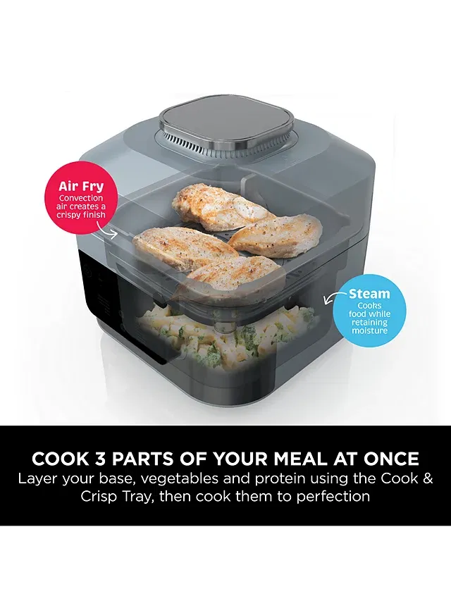 Cook 3 parts of your meal at the same time, such as teriyaki salmon with fluffy rice and vegetables, or 4 chicken breasts with creamy pasta and fresh broccoli florets. With 10 functions, you can also roast a whole 1.6kg chicken, slow cook a veggie chilli, bake a chocolate fudge cake, and so much more.