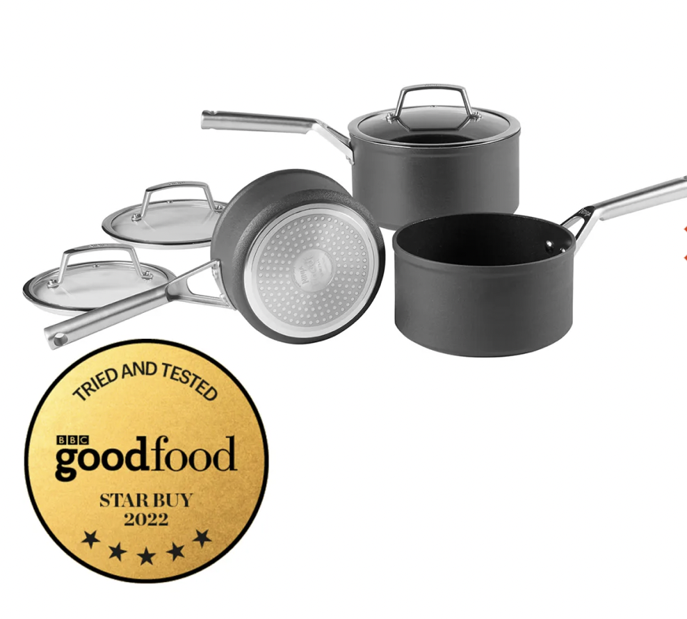 - 3 x saucepans (16cm, 18cm & 20cm) with tempered glass lids
