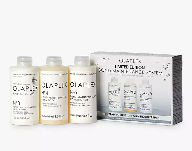 Repair, strengthen, and protect hair with a trio of global bestsellers for all hair types and textures. This limited edition set includes OLAPLEX No.3 Hair Perfector™ in the largest available at-home size, No.4 Bond Maintenance® Shampoo, and No.5 Bond Maintenance® Conditioner. Patented OLAPLEX Bond Building Technology™ repairs damage caused by hot tools, environment, chemical services, styling friction, and pollution at a molecular level.