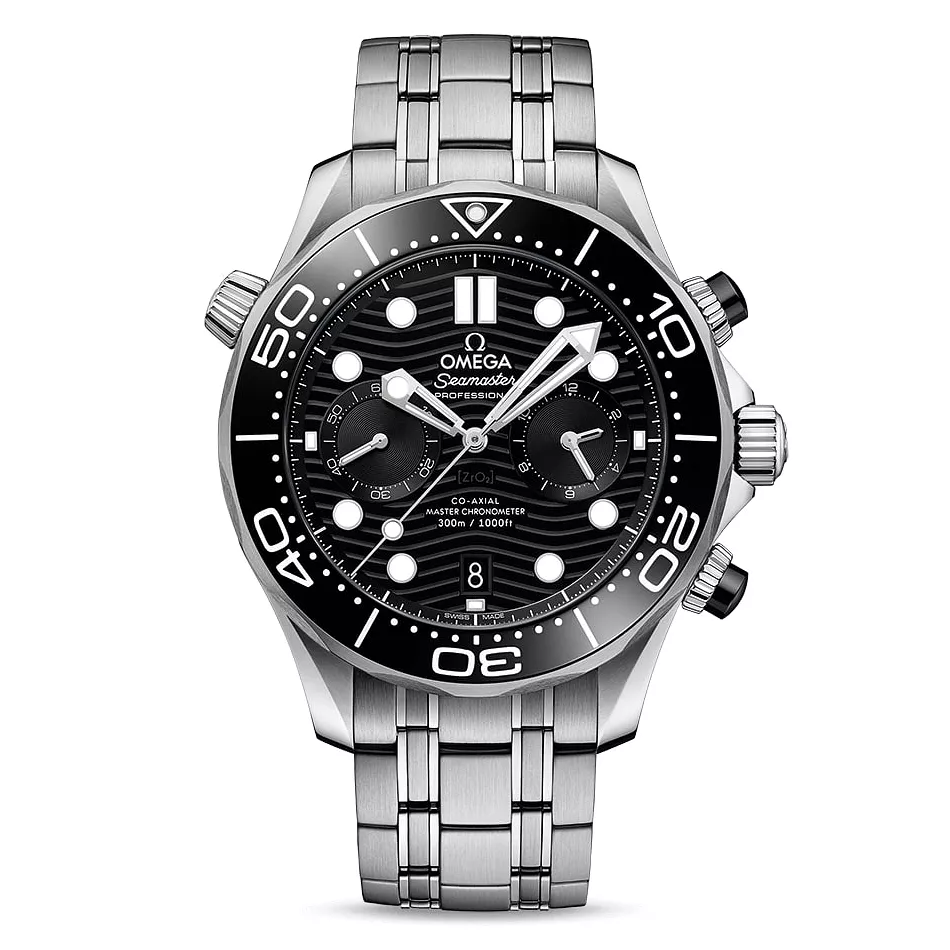 Since 1993, the Seamaster Professional Diver 300M has enjoyed a legendary following. Today’s modern collection has embraced that iconic ocean heritage and updated it with OMEGA’s highest in innovation and design. This 44mm model is crafted in sleek stainless steel and includes a black ceramic bezel with white enamel diving scale. The dial is also polished black ceramic and features laser-engraved waves and practical date display at 6-o-clock. The subdial hands are rhodium-plated, along with all other hands and indexes which are filled with white Super-LumiNova. This Seamaster Diver watch is presented on a robust stainless steel bracelet and is driven by the OMEGA Master Chronometer Calibre 9900, which can be viewed through the sapphire-crystal on the wave-edged caseback. This Omega men’s watch is water resistant up to 300 metres.