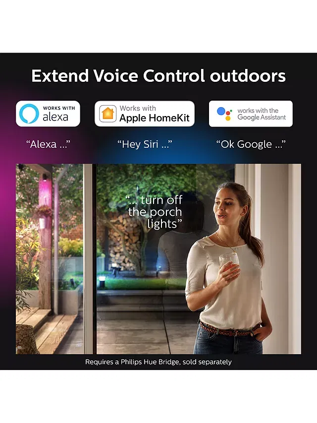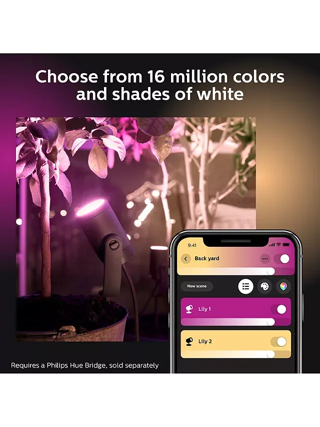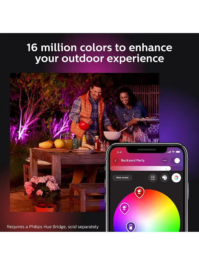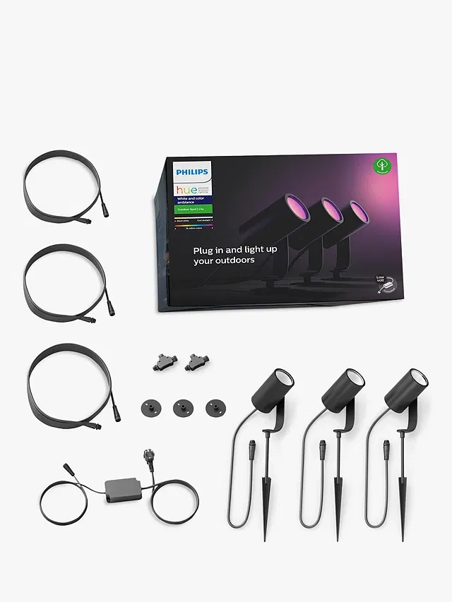 Set up the Philips Hue Lily Outdoor stake lights and paint your outdoor spaces with a wash of vibrant colour. The integrated LED in each light has 16 million colours and shades of white light so that you can create the effect you want and highlight pathways, trees or dining spaces. This practical base unit pack features 3 spotlight stakes, power supply, extension cables and the connectors that you need for installation.
