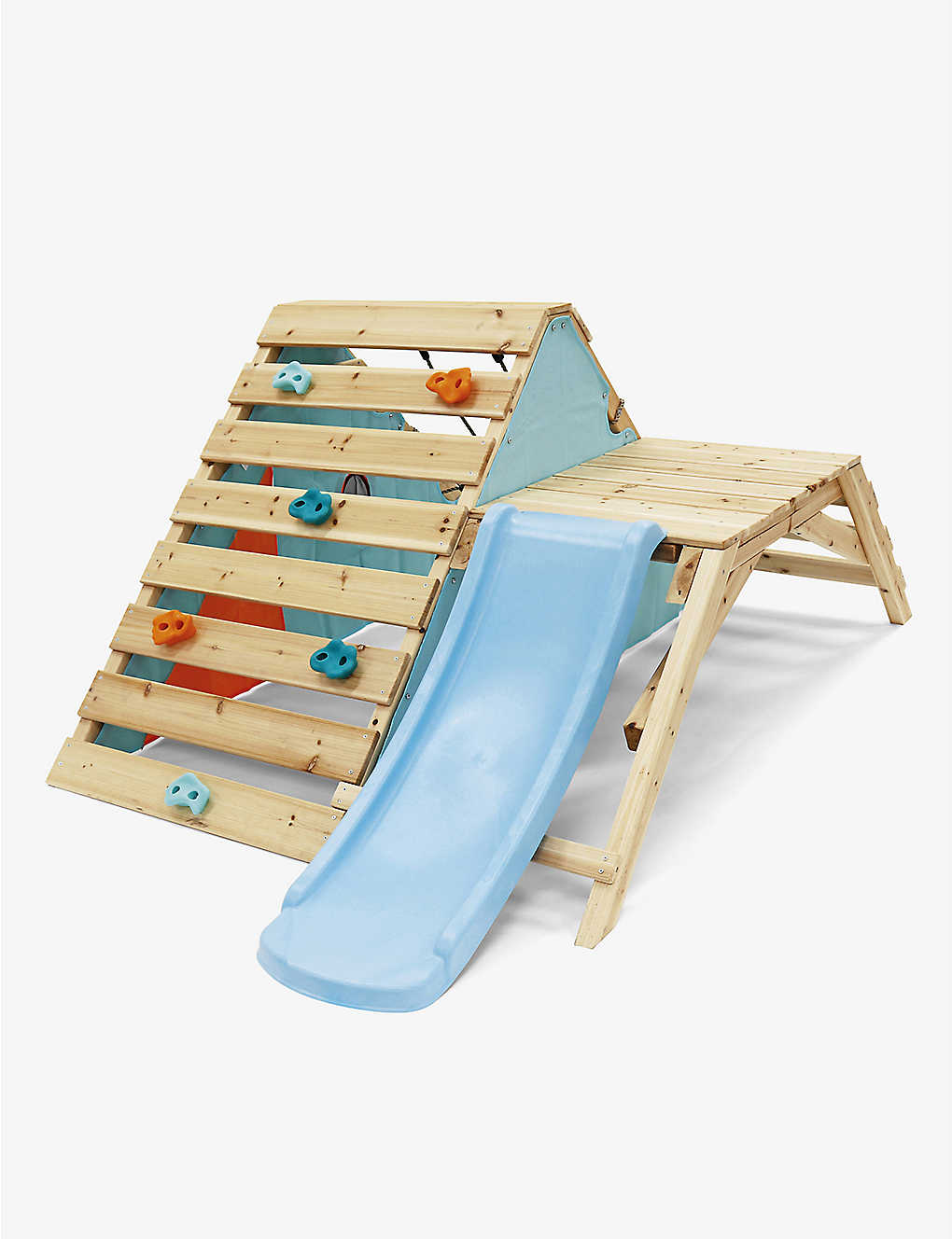 - 4ft slide, climbing wall with rock grips, covered den, cargo net
