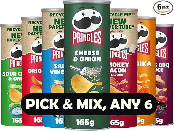 Pringles Crisps Variety Pack – Pick & Mix Any 6 Flavours – 165g Tubs – Cheese & Onion, Sour Cream & Onion, Salt & Vinegar, Original, Smokey Bacon, Paprika, Texas BBQ Sauce, Prawn Cocktail.-AUTO WIN