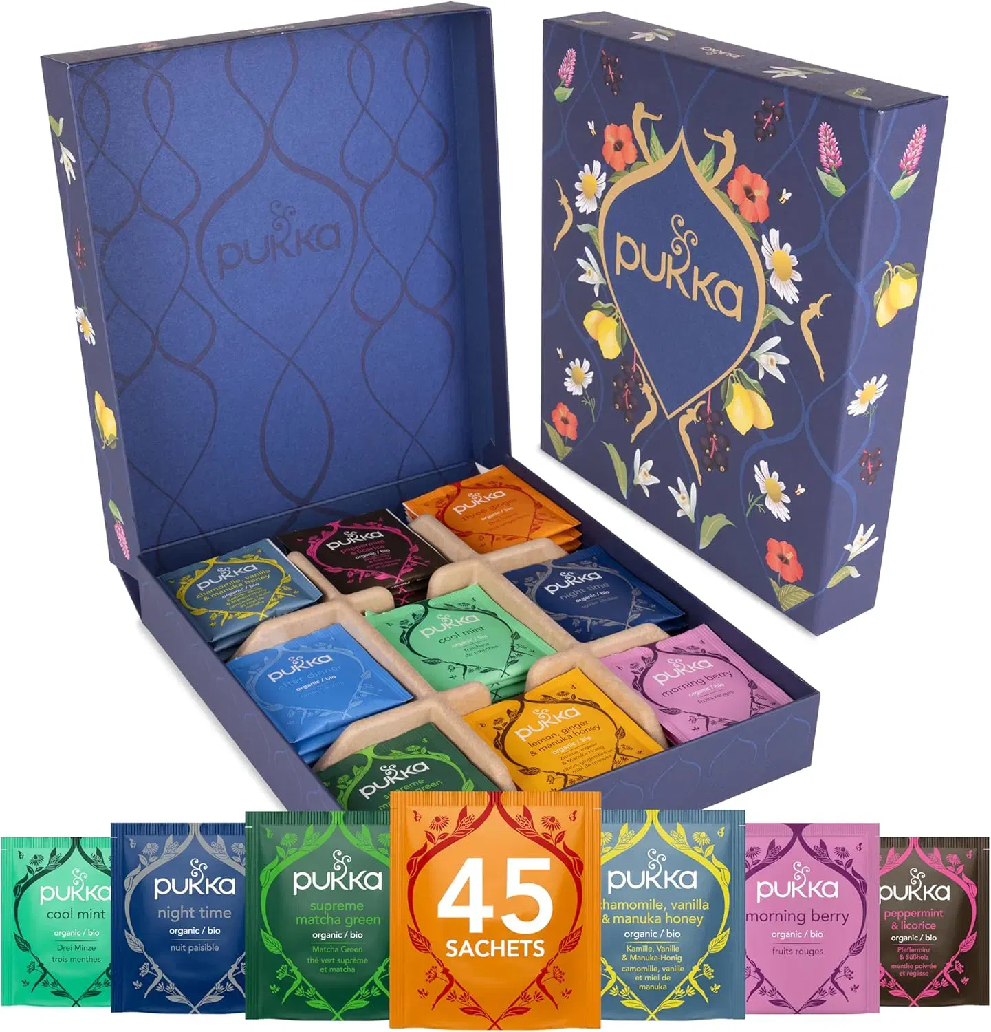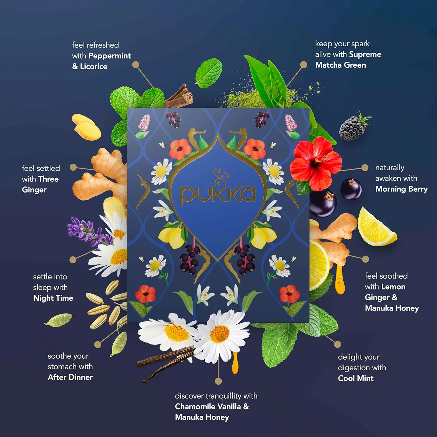 - Featuring 45 sachets of 9 delicious blends, indulge in a nourishing cup of Supreme Matcha Green, Morning Berry, Lemon Ginger & Manuka Honey, Cool Mint, Chamomile Vanilla & Manuka Honey, Night Time, After Dinner, Three Ginger and Peppermint & Licorice.
