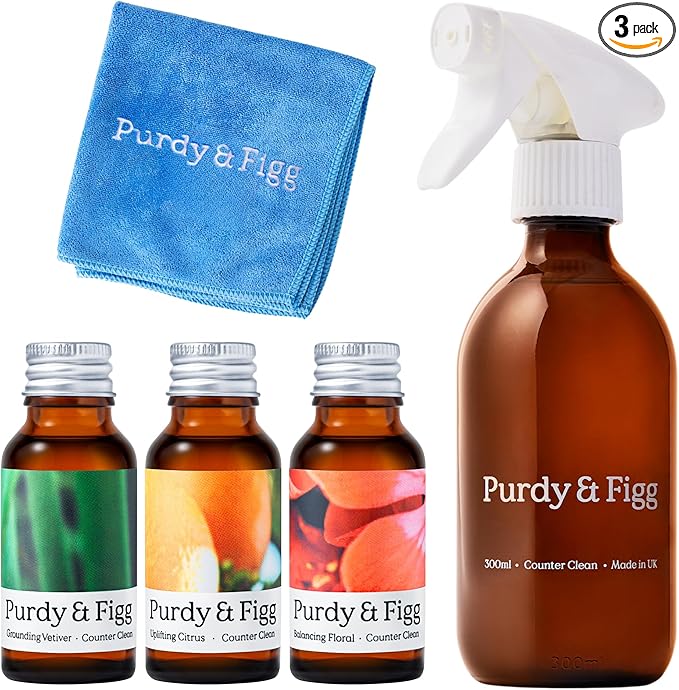 PURDY & FIGG | COUNTER CLEAN MIXED STARTER KIT | ALL NATURAL GENTLE NON TOXIC ORGANIC ESSENTIAL OILS MULTIPURPOSE CLEANER | CITRUS FLORAL VETIVER | HOME KITCHEN COUNTERTOP-AUTO WIN 26/04