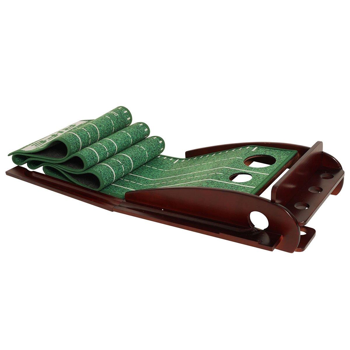 The Rife Matchplay putting mat is a luxury accessory, constructed with solid wood and a realistic putting surface. It features 2 different-sized holes to test your skills and is equipped with automatic ball-return functionality. It has visual guidelines for feedback and accuracy, with a non-slip surface underneath for stability. The mat is easy to assemble or fold away for storing, and an unfolded size of 9 feet x 12 inches.