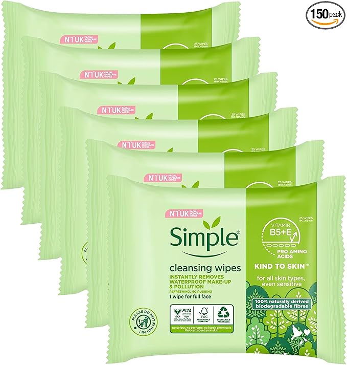 Simple Kind to Skin – Facial Wipes for sensitive skin with Glycerin, Vitamin E,and Vitamin B5 -25 pc pack of 6-AUTO WIN