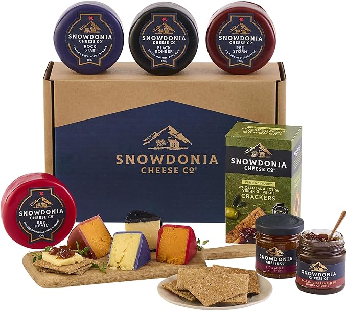Snowdonia Cheese Company | Cheese, Chutney and Cracker Gift Box | 4 Luxury Welsh Cheeses, 2 Artisan Chutneys and Wholemeal & Extra Virgin Olive Oil Crackers AUTO-WIN 10/12
