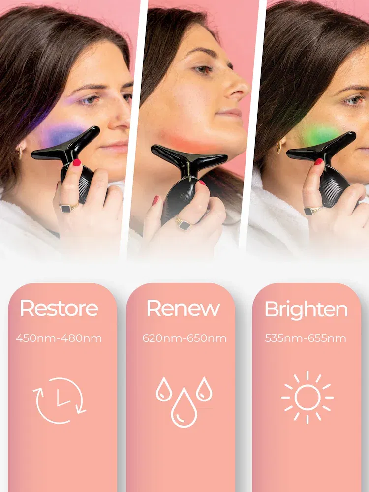 Using a combination of heat, massage, and coloured light technology, your new favourite beauty gadget helps to prevent and reduce wrinkles, age spots, acne, and uneven skin.