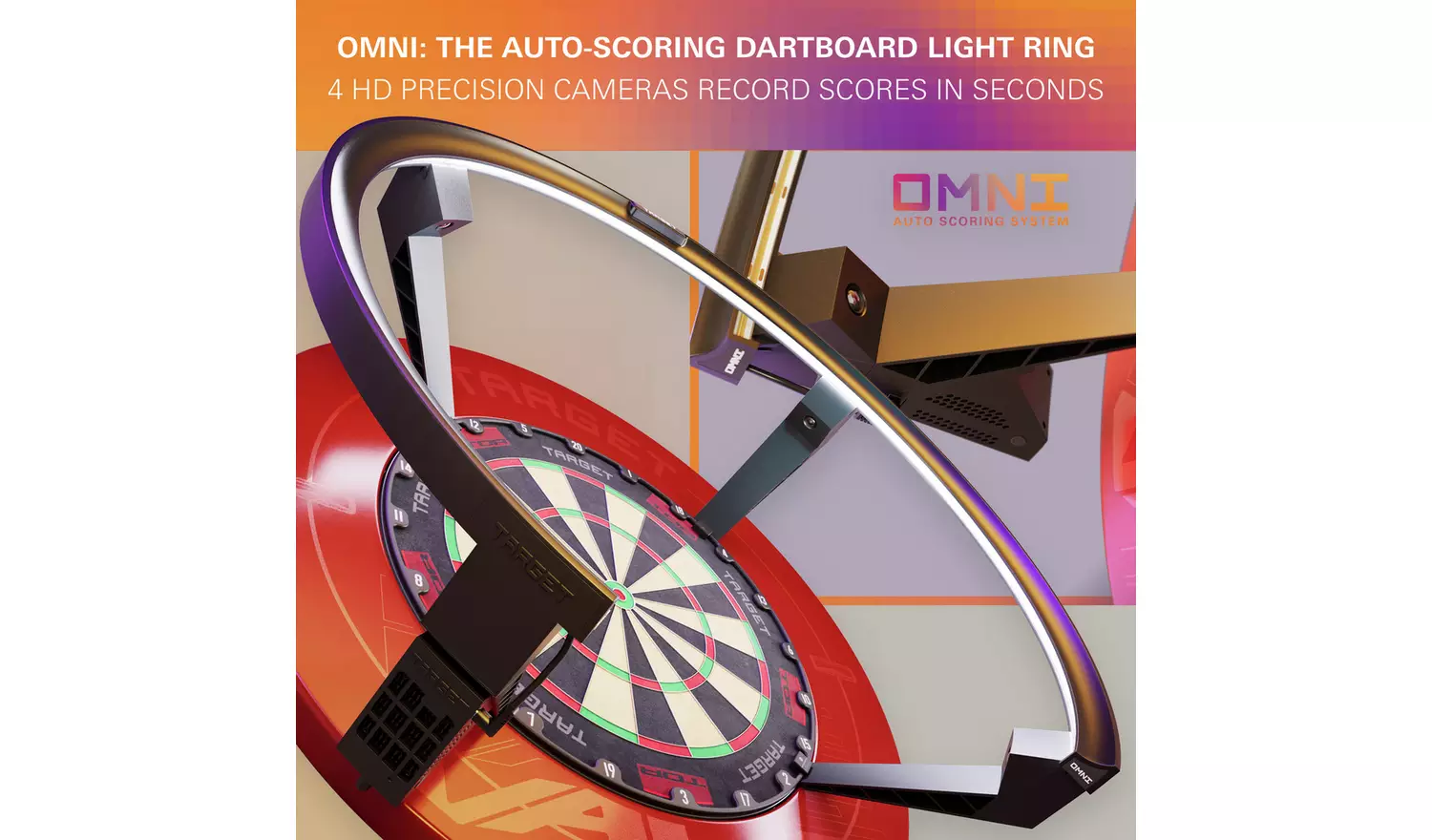 The ultimate auto-scoring dartboard light ring that revolutionises your darting experience. A state-of-the-art dartboard ring light and a powerful processing unit. The ring light is equipped with bright white LED lights and four HD precision cameras that monitor darts as they hit the board, ensuring almost flawless accuracy by calculating scores in less than a second. Omni’s advanced camera system can even detect bounce outs, ensuring every throw is accurately recorded.